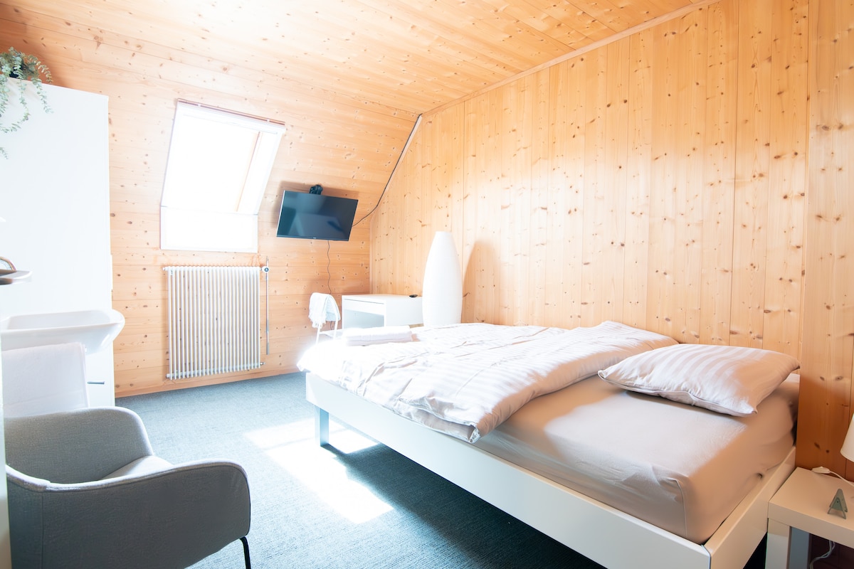 Doppelzimmer in einem fröhlichen Haushalt, ruhiges Quartier, wunderschöner Garten - unsere Gäste beschreiben ihn als paradiesisch. Aussergewöhnlicher Blick über die Stadt und auf die Alpen. In wenigen Minuten erreichst du Stadt, See, Wald, Bars und Restaurants. Das Zimmer liegt ruhig im Eingangsbereich des Hauses. Das Badezimmer im 1. Stock gehört zum Gästezimmer und ist nur für dich/euch da. Ladestation für Elektroautos Wir rechnen den effektiv verrückten Strom ab.