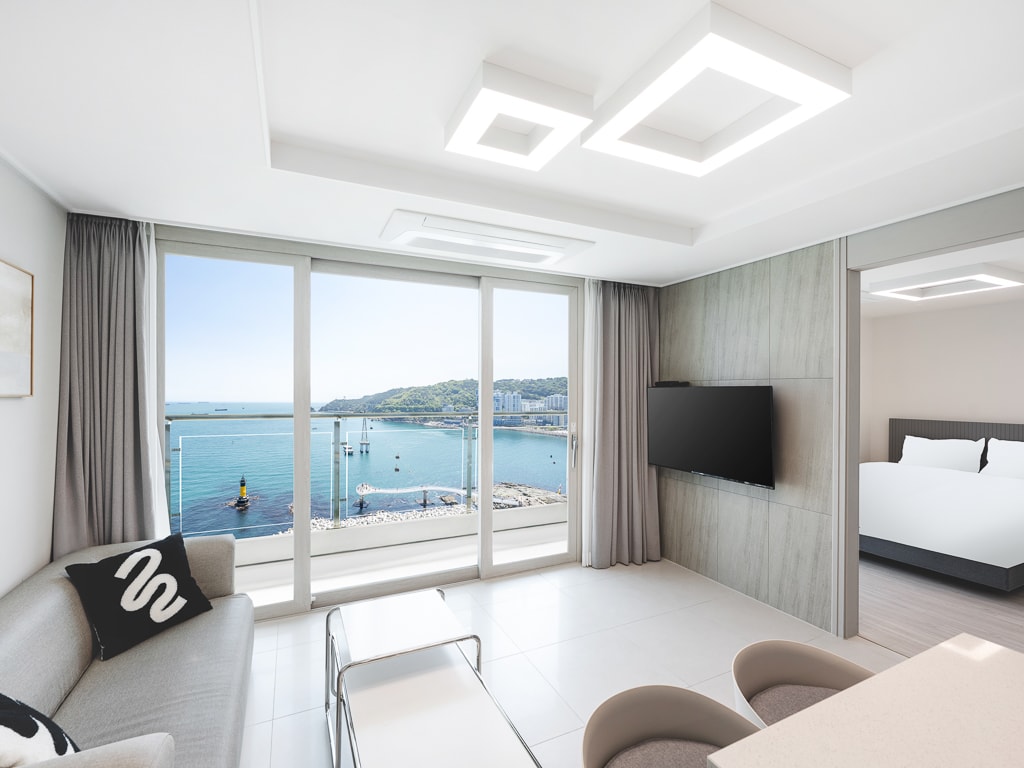 Es ist ein Raum, der sich in der Mitte des Strandes von Gwangalli befindet und sowohl Komfort als auch Stil bietet. Der Millak-Markt ist nur 5 Minuten zu Fuß entfernt, so dass Sie einen komplexen Kulturraum genießen können. Das Hotel liegt direkt vor dem Wasserpark, so dass Sie Busking-Performances sehen können, und Sie können auch eine Drohnen-Show jeden Samstagabend um 8:10 Uhr genießen.