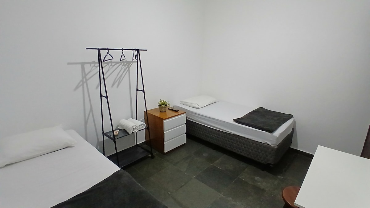 Kompakt und komplett, für bis zu drei Personen. Zentrum von Seropédica, 2 km von der UFRRJ entfernt, ideal für Studenten und Lehrer. Mit 3 Box-Betten, Klimaanlage, Deckenventilator, TV, WLAN, Tisch und Stühlen. Küche mit Kühlschrank, Spüle, Mikrowelle, Herd, Wasserfilter, usw. Individueller Waschraum mit Waschbecken. Es verfügt über eine überdachte und beleuchtete Garage. * Ein größerer Tisch mit Stühlen kann anstelle des dritten Bettes aufgestellt werden, wenn Sie kein drittes Bett benötigen.