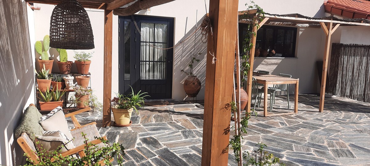 Dieses einzigartige Anwesen hat einen völlig privaten Stil, der sich durch die Verwendung natürlicher Materialien auszeichnet. Das Ferienhaus befindet sich in ausreichender Entfernung vom Haupthaus, um volle Privatsphäre zu bieten. Der Eingang befindet sich auf der Terrasse, aber die private Terrasse befindet sich auf der Rückseite, wo es auch einen Weg gibt, der Zugang zum Pool bietet. Dieser Weg wird nur von den Mietern der Casinha genutzt.