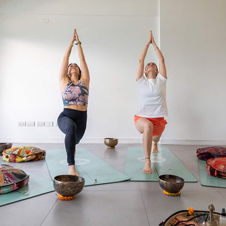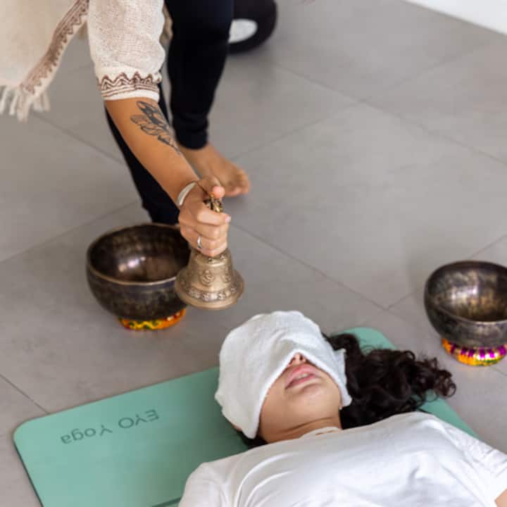 Yogapraxis, die tiefe Entspannung mit tibetischen Schalen beinhaltet. Ideal für jedes Erfahrungsniveau.