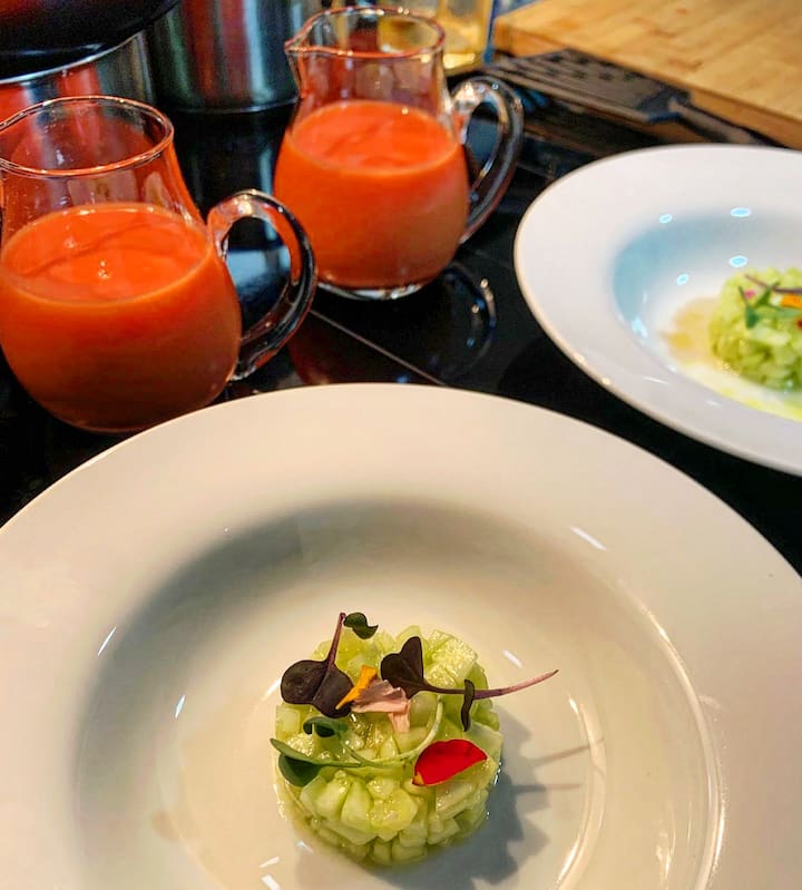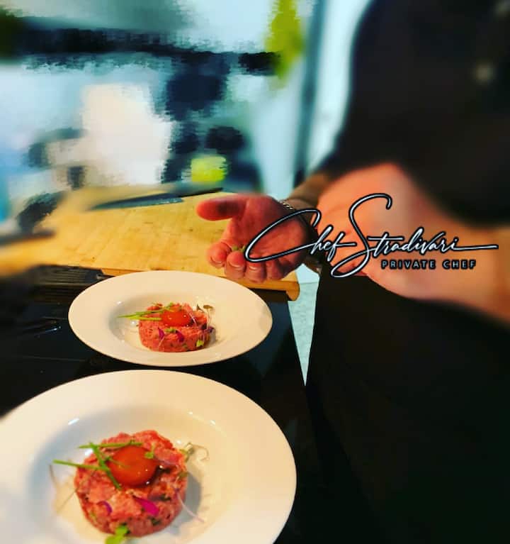 Dieses Degustationsmenü (2 Vorspeisen, 2 Hauptgerichte, 1 Dessert) wird mit einer Auswahl an mediterraner, italienischer und japanischer Küche serviert und beinhaltet den Service von Küchenchef und Kellner.