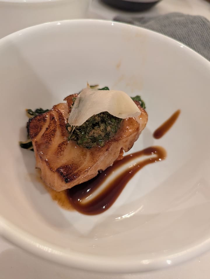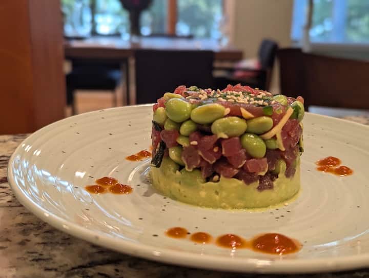 Diese spezielle Speisekarte hat viele saisonale Angebote, darunter würziger Thunfisch mit knusprigem Reis und Thai-Basilikum, Avocado und eingelegtem Rettich und Vorspeisen wie Prime Ribeye mit schwarzem Knoblauch-Trüffel-Aioli, Pomme-Püree und lokalen Pilzen aus Prospect Connecticut