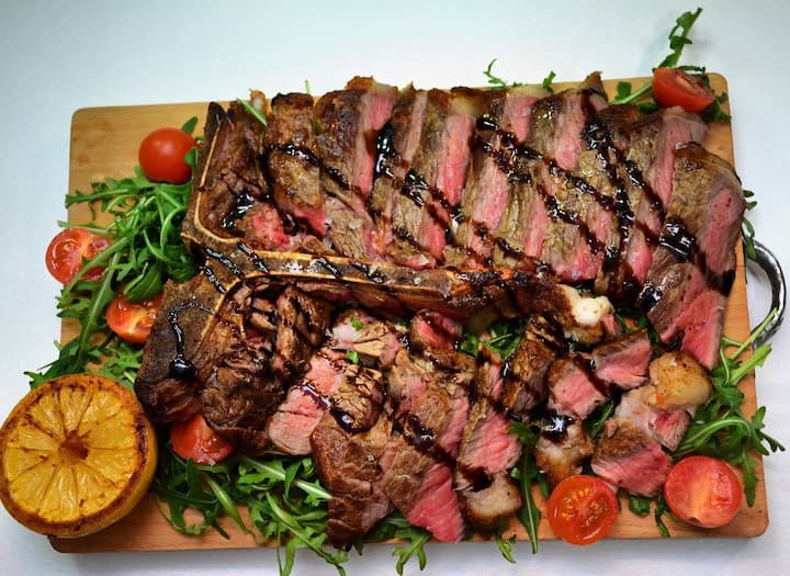 Genieße 2 Runden sprudelndes Bier mit einem gegrillten Rinder-T-Bone-Steak, serviert mit Salaten, Tomaten der Saison, gegrillter Polenta, Zwiebelsalat, Bohnen, Kartoffeldips, Mayonnaise, Ketchup und Senf. Zum Abschluss gibt es Kaffee und Tiramisu.
