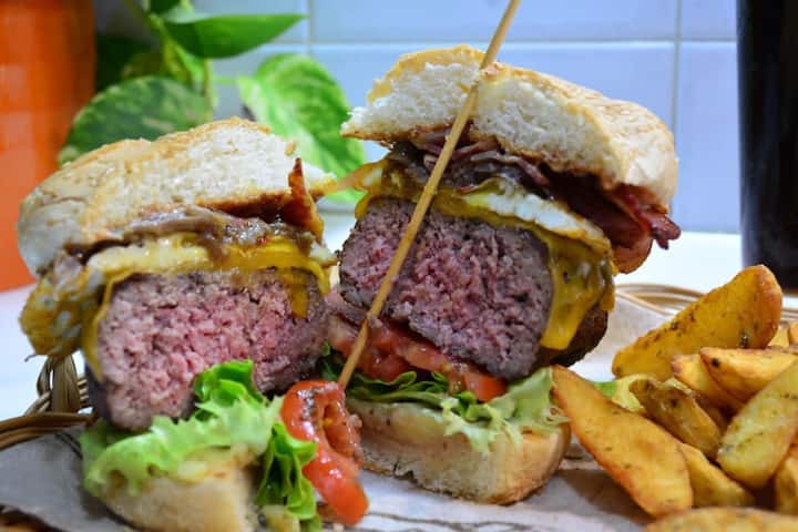 Genieße 2 Runden Bier mit einem Rindfleisch-Burger (250 g) mit Tomaten, Salat, roten karamellisierten Zwiebeln, gegrillten Pilzen, knusprigem Speck, einem Spiegelei und knusprigen Kartoffel-Dips. Zum Abschluss gibt es Kaffee und Eis in 2 Geschmacksrichtungen.
