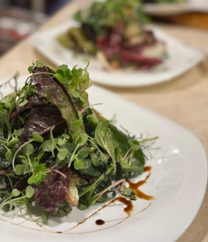 Probiere eine neu interpretierte und vegetarische Version der römischen Küche. Freue dich auf lokales Gemüse, Olivenöl und rustikale Aromen.