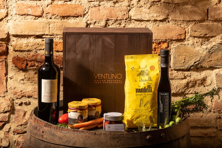 Genieße eingelegtes Gemüse, Fusilli und Chianina-Rindfleischsauce, gepaart mit Sòdole-Rotwein und nativem Olivenöl extra für 2 bis 4 Personen. VR-Tour durch die Toskana inklusive.