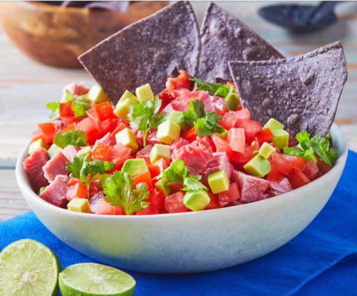 Genieße ein 4-Gänge-Menü mit Thunfisch-Ceviche, Garnelen-Consommé, Arrachera-Steak mit Kokos-Garnelen-Salat und Zitronen-Carlota zum Dessert.
