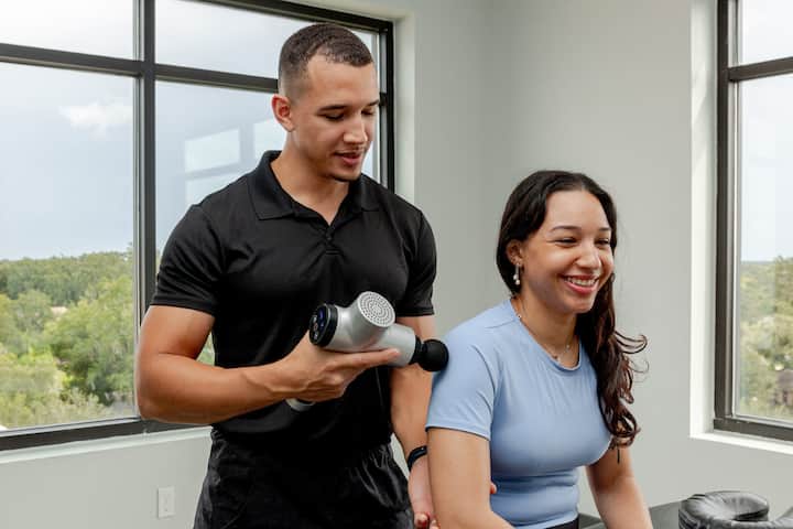 Ganzkörper-Massagepistolen-Session, die aus der Verwendung eines Handgeräts besteht, das schnelle, kontrollierte Impulse an deine Muskeln liefert, um Verspannungen und Knoten zu lösen, den Blutfluss zu erhöhen, Schmerzen zu reduzieren, die Flexibilität zu verbessern und die Entspannung zu fördern.