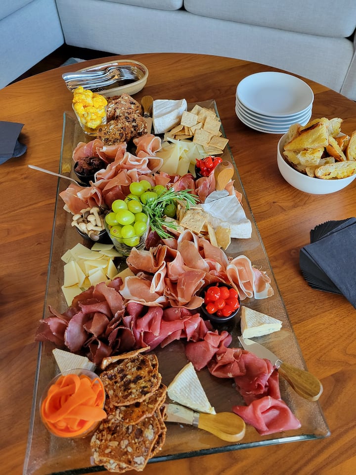 Auswahl an Canapés, Wurstwaren und Käse, die vor Beginn deiner Party bereitgestellt werden.