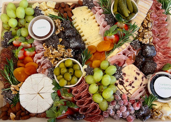 Das XLarge Rechteck (19"x14") Holzbrett enthält eine Vielzahl von Fleisch, Käse, frischem und getrocknetem Obst, Nüssen, Honig, Marmelade und anderen Beilagen. Der Inhalt der Verpflegung kann je nach Verfügbarkeit und Saison geändert werden und kann bis zu 15 Personen bedienen.