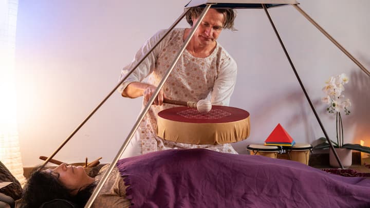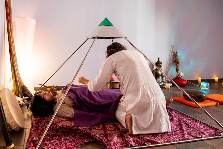 Ein einzigartiges Erlebnis, das die Klangschwingungen schamanischer Instrumente mit der energetischen Kraft der Pyramide und den Vorteilen der Farbtherapie verbindet. Die Pyramide sammelt und verstärkt die kosmische Energie und gibt sie nach innen zurück, um Harmonie und tiefe Regeneration zu fördern.