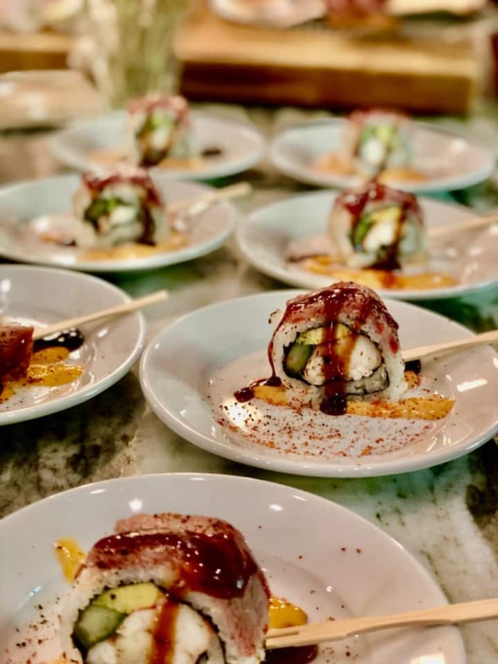 Genießen Sie ein komplettes Sushi-Erlebnis mit allen Gerichten inklusive: Beginnen Sie mit frischem Yellowtail-Sashimi und einem Ahí-Poke-Turm, gefolgt von Edamame und Miso-Suppe.Als Hauptgang empfehlen wir Ihnen Spicy Tuna Roll, Shrimp Tempura Roll, Tuna and Yellowtail Nigiri, dazu Reis, Ingwer, Wasabi und Ponzu.Zum Abschluss gibt es noch köstliches Mochi-Eis.