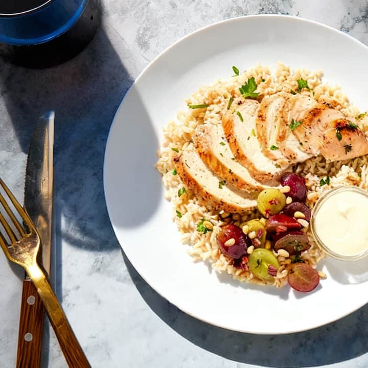 Erntehuhn | Mit Ziegenkäse gefülltes Brathähnchen auf braunem Reis-Pilaw mit Trauben und Pinienkern-Balsamico-Salsa.