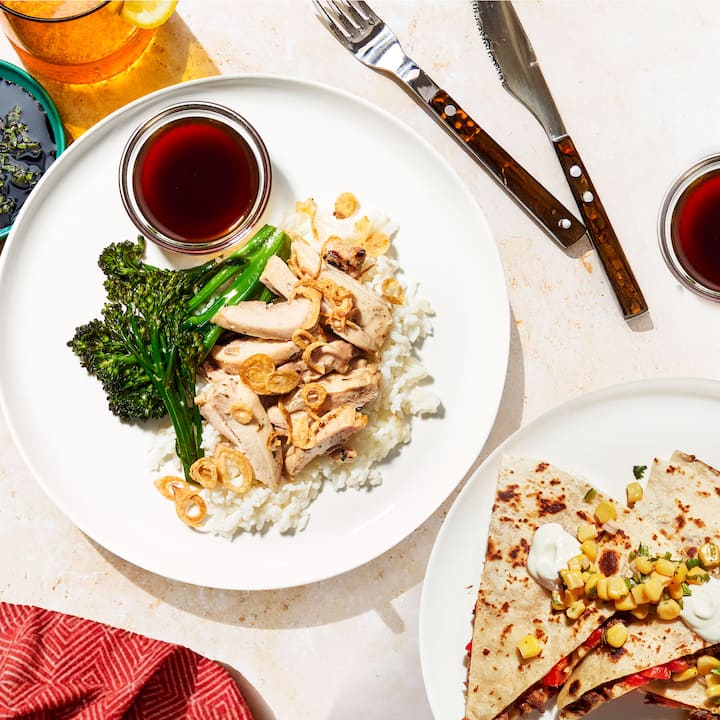 4 Mahlzeiten. Genieße die süßen und herzhaften Bestseller von Chefköchin Esther Choi – mit Chicken Teriyaki (glasiertes Hühnchen mit weißem Furikake-Reis und leicht verkohltem Broccolini) und koreanischer Rindfleisch-Quesadilla (gegrillte Tortilla gefüllt mit geschmortem Rindfleisch, geschmolzenem Käse und roten Paprika, serviert mit Limettensauerrahm und Maissalsa). Enthält 2 von jeder Mahlzeit.