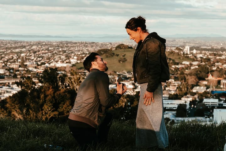 Diskrete Fotografie für Überraschungsanträge, die sich darauf konzentriert, echte Reaktionen und Emotionen einzufangen. Aufnahme mit natürlichem Licht mit einem entspannten, unaufdringlichen Ansatz. Ideal für Heiratsanträge an Orten im Freien oder in intimen Umgebungen.