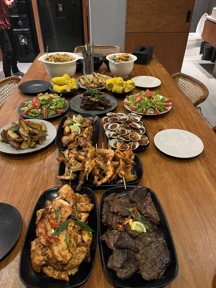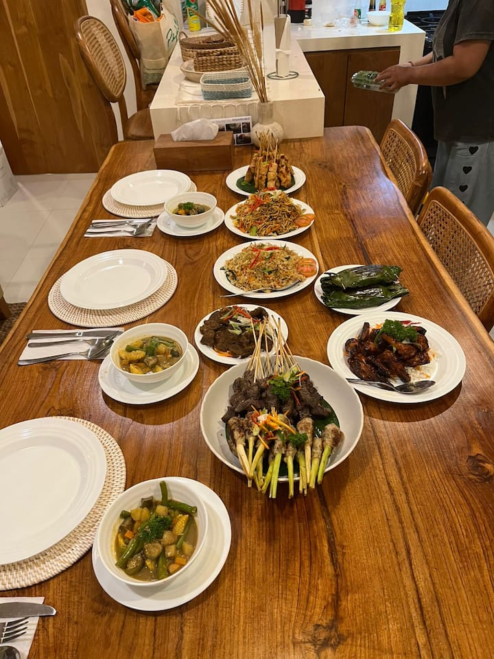 Veranstalte ein lebhaftes Grillabendessen in deiner Villa. Beinhaltet indonesische Frühlingsrollen und gemischten Salat, gefolgt von Reis oder gebratenem Reis, Kräuterkartoffeln, gegrilltem Gemüse und Mais. Die Grillauswahl umfasst Garnelen, Fisch, Austern, Schweinerippchen, Rindersteak und gegrilltes Hähnchen mit verschiedenen Saucen. Zum Abschluss kannst du zwischen Tiramisu, Schokoladenmousse, Obst oder junger Kokosnuss wählen. Dieses Menü ist auf Anfrage zum Mittag- oder Abendessen verfügbar. Der Service deckt Kuta Utara ab, andere Gebiete sind gegen eine zusätzliche Transportgebühr verfügbar.