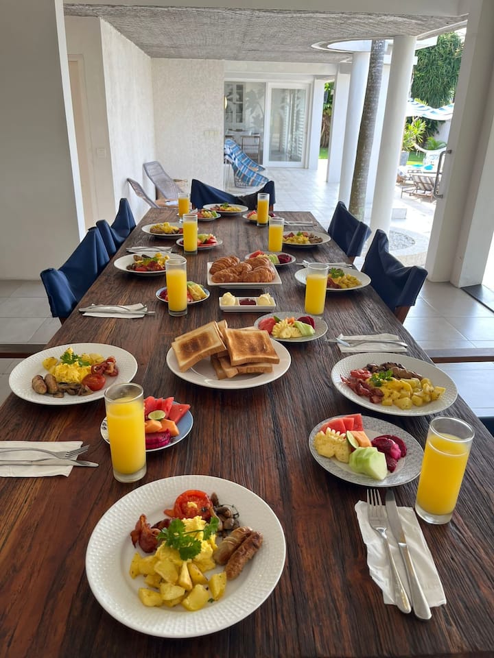Genieße ein frisch zubereitetes Frühstück in deiner Villa mit Optionen: BALINESE beinhaltet deine Wahl zwischen Nasi Campur, Nasi Kuning oder Bubur Bali. INDONESISCH umfasst deine Wahl zwischen gebratenem Reis oder gebratenen Nudeln. AMERIKANISCH umfasst Eier jeder Art mit Speck oder Wurst, Bratkartoffeln und einen Brotkorb. KONTINENTAL beinhaltet Brotkorb und Haferflocken. Alle kommen mit geschnittenem Obst, Saftauswahl und Tee oder Kaffee. Schwimmende Einrichtung und Service außerhalb von Kuta Utara sind auf Anfrage gegen Aufpreis verfügbar.