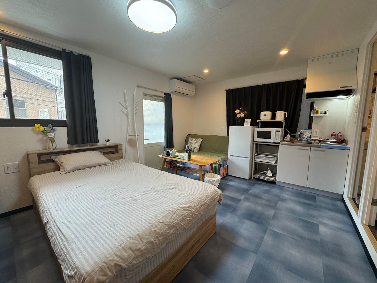 Diese Unterkunft ist ideal für einen mittel- bis langfristigen Aufenthalt mit der Familie oder Freunden. Es ist ein Apartmenthotel, das 2023 in einem ruhigen Wohngebiet in der Nähe des Stadtzentrums eröffnet wurde. In der Nähe befinden sich ein Wasserbecken, ein Park und ein Schrein. Die geräumigen 35 m² großen Zimmer sind im japanischen Stil eingerichtet. Es gibt ein Queensize-Bett und drei Futons, die Platz für bis zu fünf Erwachsene bieten. (Kinder unter 2 Jahren schlafen kostenlos.) Es gibt eine kompakte Küche, in der Sie selbst kochen können, eine vollautomatische Waschmaschine mit Trockner, ein geräumiges Badezimmer und eine separate Toilette. Es gibt auch Android-TV und kostenloses WLAN, so dass es eine ausreichende Umgebung ist, um drinnen zu verbringen oder zu arbeiten. Sie können sich auch auf der Dachterrasse entspannen, die für Gäste geöffnet ist. Der Check-in erfolgt über ein eigenständiges Tablet-System, sodass Sie auch spät in der Nacht einchecken können. Die Tür wird durch ein hochmodernes Tastensystem verwaltet. Es befindet sich 5 Gehminuten vom Ausgang der nächsten U-Bahn-Station (Sumiyoshi Station, Hankyu Line, Toei Shinjuku Line) entfernt und in der Nähe gibt es einen Supermarkt. Bitte entspannen Sie sich mit Ihrer Familie in dieser ruhigen Unterkunft.