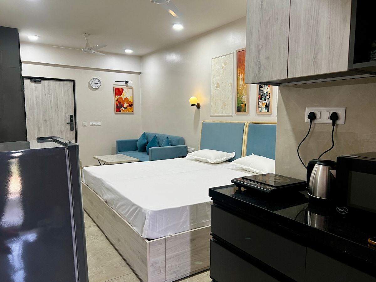 Willkommen im The Starlit Stays – einem gemütlichen, modernen Studio-Apartment, das sich perfekt für Alleinreisende und Paare eignet. Nur einen kurzen Spaziergang von Einkaufskomplexen, Gemischtwarenläden und medizinischen Einrichtungen entfernt, ist es dein idealer Rückzugsort in der Stadt. Genieße intelligente Annehmlichkeiten wie einen Fernseher, WLAN, Klimaanlage, Kamin, Kühlschrank, RO-Wasserreiniger, Geysir und Zugang zum Aufzug. Mit 24/7 CCTV-Sicherheit ist dein Aufenthalt sowohl sicher als auch komfortabel. Ein ruhiges, stilvolles Refugium für Komfort und Verbindung.