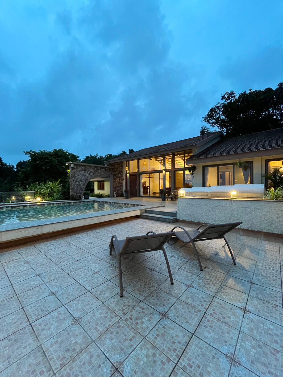 Umgeben von den schönen grünen Hügeln, begleitet von dem frischen Bach von Sahyadri, der seinen Rand fließt, bietet ein glückseliges Heiligtum abseits des Chaos des städtischen Lebens. An unserem ruhigen Ort wirst du vom Rascheln der Blätter umarmt, die melodischen Vogelrufe. Die einzigartigen, warm getönten, erdigen Oberflächen ergänzen weiß getünchte Wände, um eine ruhige Atmosphäre zu schaffen. Mach das Beste aus dem tropischen Wetter und verbringe deinen Tag damit, im Pool zu schwimmen, indem du barfuß auf der üppigen, wunderschön gepflegten Rasenfläche spazieren gehst.