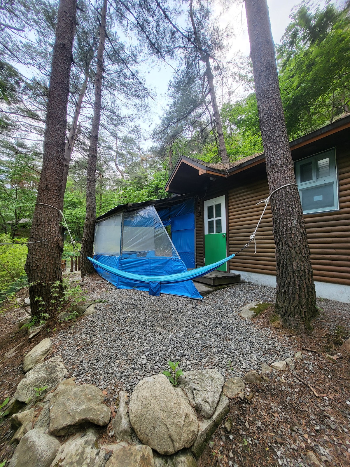 Campinghaus (separates Gebäude) _ Gangneung, Privathaus, Wohnhaus, Hundebegleitung, Mehrstöckig, Zaun, Grill, Wald