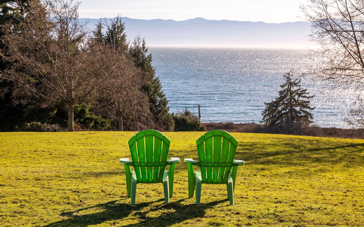 Ein gemütliches, privates Haus mit großen Rasenflächen und Blick auf das Salish Sea und die Olympic Mountains. Wenn du 4 Minuten nach Westen fährst, erreichst du den schönen Gordon's Beach. Innerhalb von 30 Minuten findest du Sandcut, China und Mystic Beaches. Wir sind 10 Minuten westlich der Annehmlichkeiten von Sooke oder 40 Minuten von Victoria entfernt. Wandern, Strandwandern, Walbeobachtung, Angeln, Surfen, Traillaufen und Mountainbiken sind alle in der Nähe.
