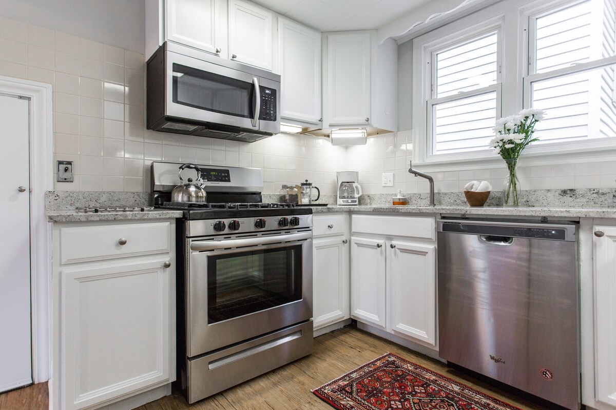 Gemütliche Wohnung im englischen Garten (300 Quadratfuß) mit eigenem Eingang und kostenlosem Parkplatz abseits der Straße. 4 Gehminuten von der Blue Line entfernt. Hell beleuchtet/hohe Decke. Verstellbares Tempupedic-Memory-Schaum-QUEEN-Size-Bett plus Futon im Wohnzimmer. Küchenzeile mit Mini-Kühlschrank, Nespresso & Keurig, Toaster, Mikrowelle und Waffeleisen mit Ahornsirup. Designer-Bad. Mehr als 30 Restaurants/Bars in der Nähe (siehe REISEFÜHRER BK in LAGE). Eigenständiger Check-in. Flexible Stornierung. Frühe Gepäckabgabe. Ein Ort zum Entspannen – kunstvoll und künstlerisch im Design, NICHT langweilig oder IKEA-mäßig!