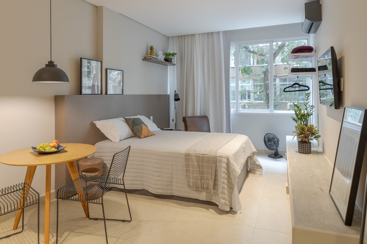 Loft mit Wabi-Sabi-Design in der besten Gegend von Rio de Janeiro: Posto 10 Ipanema. Mit privilegierter Adresse zwischen dem Strand von Ipanema und der Lagune und in der Nähe der besten Restaurants und Unterhaltungsmöglichkeiten der Gegend. Der Strand, der See, Leblon und die U-Bahn-Station sind nur zwei Blocks entfernt. Gemütlicher Raum, komplett renoviert und ausgestattet, ideal zum Entspannen und Genießen einer Badewanne mit Blick in den Himmel. Für Geschäftsreisende bieten wir einen Arbeitsbereich mit 750MB Internet.