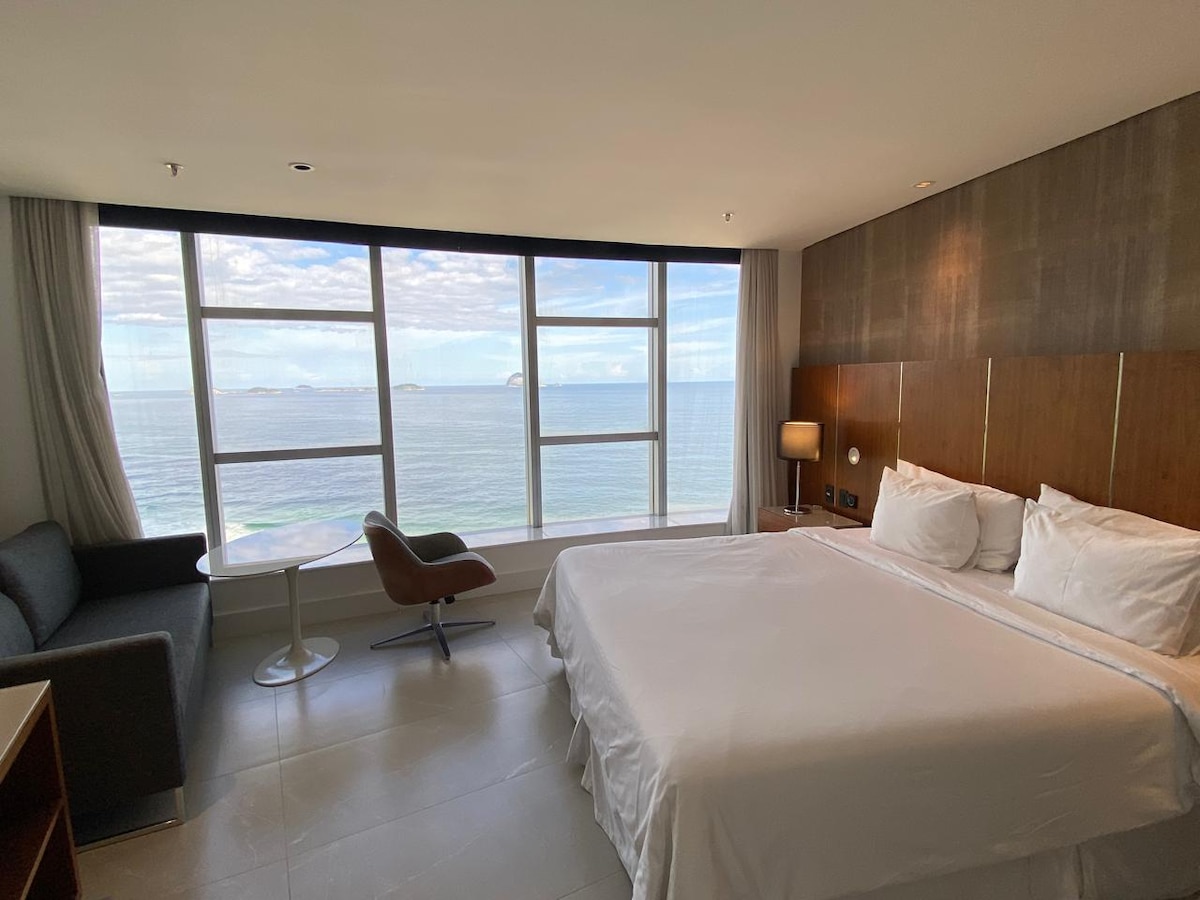 Übernachte im Hotel Nacional, in einer luxuriösen Suite mit Kingsize-Bett und Platz für bis zu 4 Personen. Genieße einen herrlichen Blick auf das Meer von São Conrado und entspanne dich in allem Komfort und Stil, den du verdienst. Perfekt für einen Familienurlaub oder besondere Momente. Jetzt buchen!