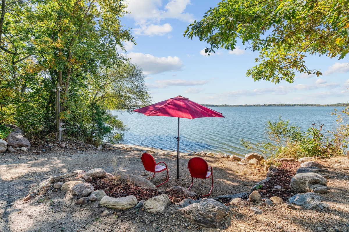 Erlebe über 130 Fuß Privatstrand, an dem du schwimmen, angeln, Bootfahren (Kajaks, Paddleboards, Tretboot) genießen und Sonnenuntergänge beobachten kannst. Unter einem Baldachin aus alten Bäumen gibt es eine Terrasse, Gas- und Holzkohlegrills, eine Feuerstelle, Gartenspiele und eine Schaukel um ein fast 1 Hektar großes Anwesen. Ebene 1 verfügt über eine voll ausgestattete Küche mit mehreren Essbereichen; ein Badezimmer mit Badewanne; ein großes Wohnzimmer mit Kamin, 2 ausziehbare Sofas; und eine Hauptsuite am See mit Kamin. Ebene 2 umfasst ein halbes Bad mit 2 Schlafzimmern für jeweils 6 Personen.
