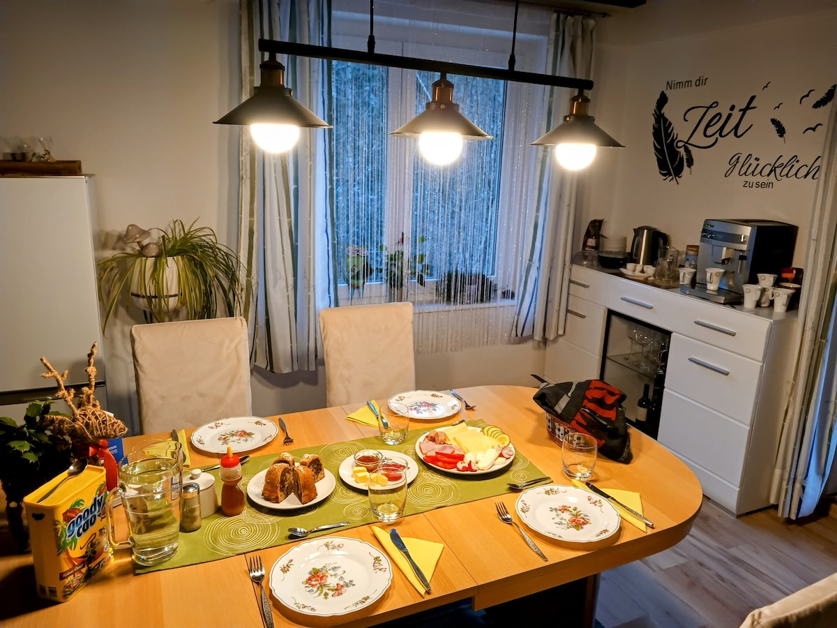 Eintauchen in die Natur, Kraft tanken und Ruhe genießen. Ihre Wohnung ist über eine Aussentreppe erreichbar und befindet sich in einer ruhiger Lage, ohne Trubel und Lärm. Ausgangspunkt für viele Wanderwege und Ausflugsziele, direkt am Weg zum Lugauer. Für ihre Kinder ist genug Platz um zu Spielen , Tiere streicheln und beobachten. Zum Entspannen haben sie am Waldesrand Sitzgelegenheiten und Platz zum Grillen.