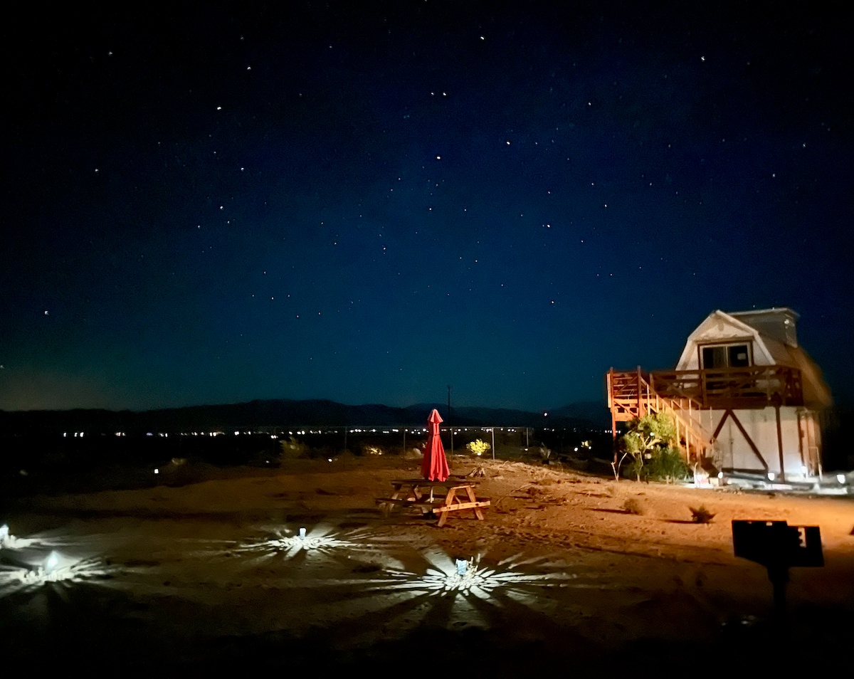Genieße das Wonder Valley in diesem charmanten, originellen Gehöft auf 5 privaten Hektar mit Blick auf die Schönheit der Wüste und des Joshua-Tree-Nationalparks. Abgeschieden genug, um die Wüstenlandschaft zu genießen, und nur 10 Minuten vom Nordeingang des Joshua-Tree-Nationalparks entfernt. 7 Minuten zu 29 Palms mit einer blühenden Szene mit Bars, Einkaufsmöglichkeiten, Notwendigkeiten und Restaurants Unsere weitläufigen 5 Hektar verfügen über einen Cowboy-Pool und eine Terrasse, Ess- und Sitzbereiche im Freien, eine Hängematte, einen Spielbereich, eine Sternenbeobachtungsterrasse und eine endlose Aussicht!