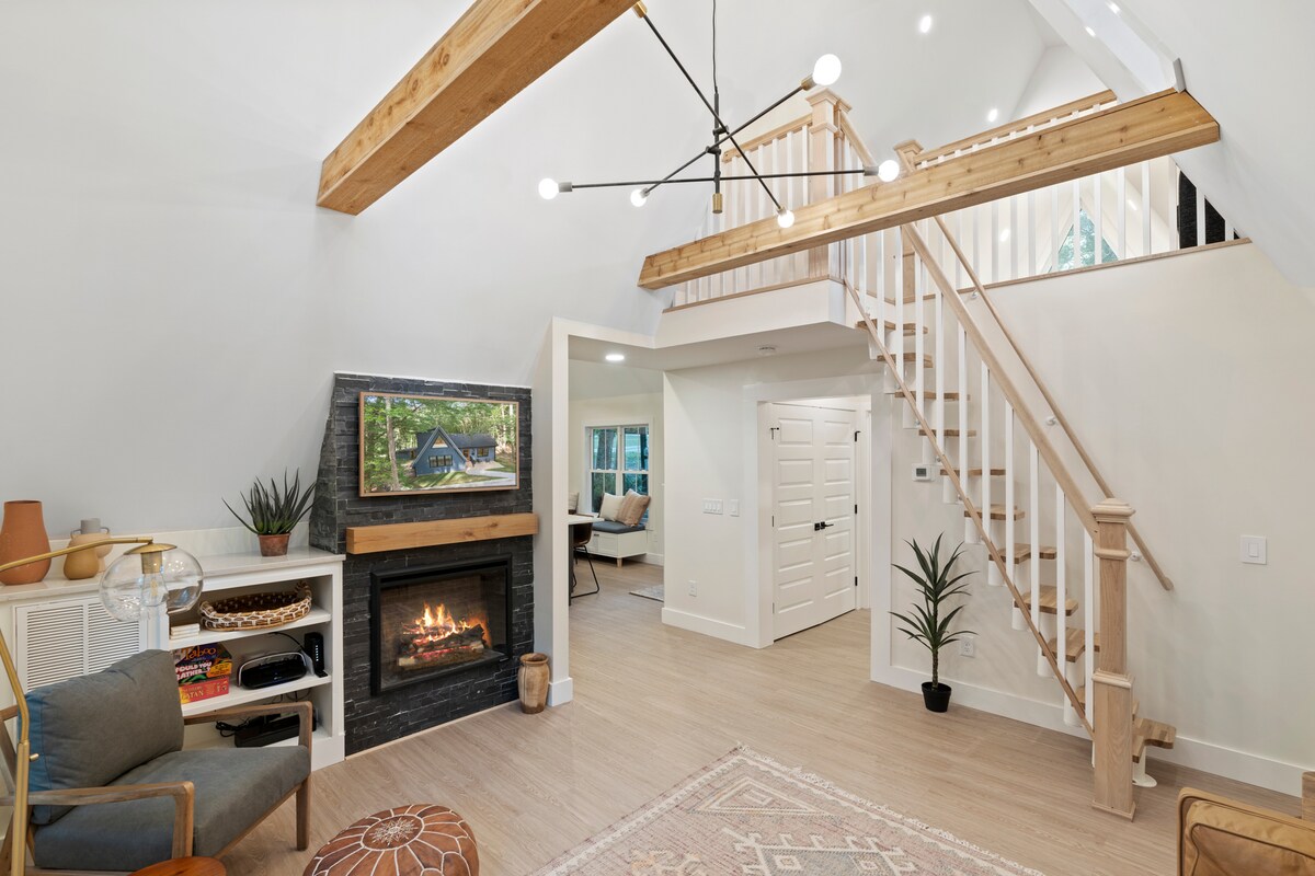 BRANDNEUE (2022) maßgeschneiderte A-Rahmen-Hütte am Seeufer. Mid-Century Modern. Du wirst das stilvolle Ferienhaus und das ganze Leben/Spielen im Freien. Schließe den Spaziergang zu deinem eigenen privaten Dock (2 Bootsrutschen) und Bootsrampen in der Nähe. Direkt am Kerr Lake gelegen (auch bekannt als Buggs Island) gelegen. NEU für 2024; KOMPLETT NEUES BADEZIMMER, NEUES stabiles Internet, Beton-Gehweg, Solostove-Feuerstelle-Terrasse, NEUER Whirlpool, Terrassenbeleuchtung, Gasgrill, Außendusche. Spielzeug ausgelassen; Wagen zum Transportieren, Kajak für Kinder, Kajak für Erwachsene, Paddelbrett und Liegestühle.