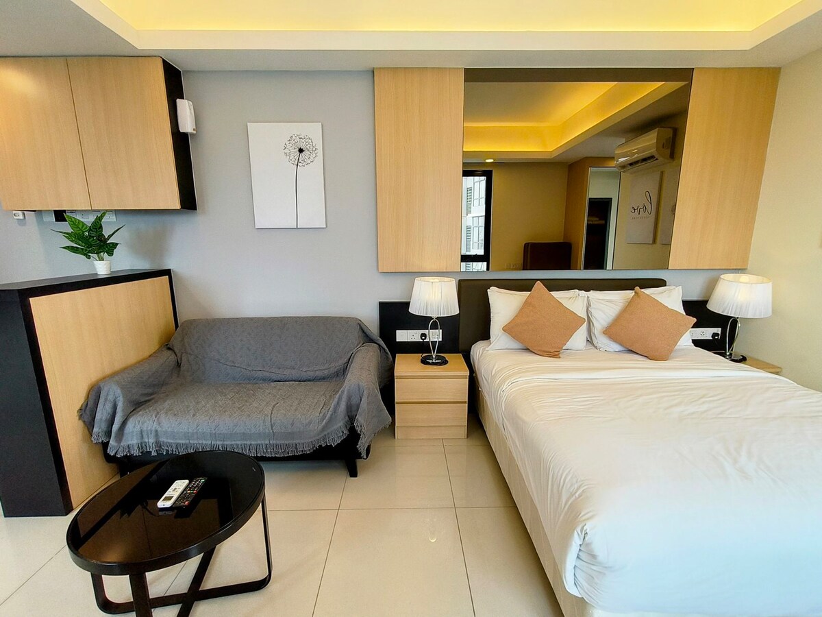 Öffne morgens die Vorhänge im Schlafzimmer und genieße den atemberaubenden Blick auf die Stadt – den gleichen Ausblick, den du auch vom praktischen Schreibtisch aus hast. Beruhigende Taupe- und Grautöne sorgen für ein raffiniertes Ambiente. Moderne Badezimmer- und Küchendetails machen dies zu einem idealen Ausgangspunkt für Erkundungstouren. Meine geschätzte 900 Quadratfuß große Einzimmer-Service-Wohnung ist voll möbliert und voll klimatisiert mit integriertem Wohn-, Ess-, Küchen- und Schlafzimmerbereich Wohnen: Komfortables 3-Sitzer-Sofa, Loungesessel und ein Flachbildfernseher, um Gästen einen komfortablen Ort zu bieten, um Freizeit zu verbringen Küche: Möchtest du deine eigene Mahlzeit zubereiten? Keine Sorge, diese moderne und gut ausgestattete Küche hat alles, was du brauchst, um dein Essen entweder für dich selbst oder für deine Liebsten zuzubereiten. Sei nicht überrascht, dass sie sogar eine Waschmaschine hat, die mit einem hier eingebauten Trockner kommt Essen: Ein einfacher und gemütlicher Esstisch, der neben der Küche liegt, um bequem zu servieren. Bereite deine eigene Mahlzeit zu und genieße das Essen hier sowie ein Lachen und stärke Beziehungen. Schlafzimmer: Der Ort, an dem du dich am Ende des Tages versteckst, um dich auszuruhen, zu entspannen, bevor du in einen glückseligen Schlaf abgleitest. Dieses geräumige und komfortable Zimmer verfügt über ein Kingsize-Bett, einen begehbaren Kleiderschrank und einen Schreibtisch, einen Flachbildfernseher und auch einen privaten Zugang zu einem hervorragenden Badezimmer, das dir eine unvergessliche Ruheumgebung bietet. Zu guter Letzt steht Gästen in meiner Wohnung ein kostenloser WLAN-Internetzugang zur Verfügung, damit Gäste jederzeit mit Freunden und Familie in Kontakt bleiben oder sich um ihre Angelegenheiten kümmern können. Die Gemeinschaftseinrichtungen des Sky Gym, das sich auf der 39. Etage befindet, Infinity-Pool, Spielzimmer und Kinderspielplatz auf der 5. Etage, die täglich von 7:00 bis 22:00 Uhr geöffnet sind. Bitte frage so viel oder so wenig, wie du möchtest. Die Wohnung befindet sich im Fraser Residence Hotel im Zentrum von Kuala Lumpur. Sie liegt 800 m von den Petronas Twin Towers und dem Einkaufszentrum Suria KLCC entfernt. Was die Bequemlichkeit betrifft, so ist der Lebensmittelladen nur eine Minute entfernt, öffentliche Verkehrsmittel sind nicht nur in wenigen Minuten zu Fuß erreichbar, wie die Bukit Nanas Monorail Station (5 Min.) und die Dang Wangi LRT Station (7 Min.), sondern Gäste können auch zu Fuß das nahe gelegene Malaysia Tourism Centre (7 Min.), die Petronas Twin Towers (18 Min.), das Hard Rock Café (8 Min.), den Kuala Lumpur Tower (29 Min.) und viele andere Sehenswürdigkeiten erreichen. Es gibt auch einen öffentlichen Busservice (GOKL City Bus), der Fahrgästen kostenlos für Pendler innerhalb des Central Business District von Kuala Lumpur angeboten wird. Du bist herzlich eingeladen, zu einigen der beliebten Orte wie Pavillion, Bukit Bintang, Petronas Twin Tower, Pasar Seni und vielen mehr zu reisen... Wir bieten eine kostenlose Reinigung (einmal pro Woche) für diejenigen, die 7 Nächte und mehr bleiben, was den Wechsel von Bettwäsche, Handtüchern und die Grundreinigung beinhaltet. (Auf Anfrage – ein Tag im Voraus) Die Wohnung befindet sich in 188 Suites im Zentrum von Kuala Lumpur. Sie liegt 800 m von den Petronas Twin Towers und dem Einkaufszentrum Suria KLCC entfernt.