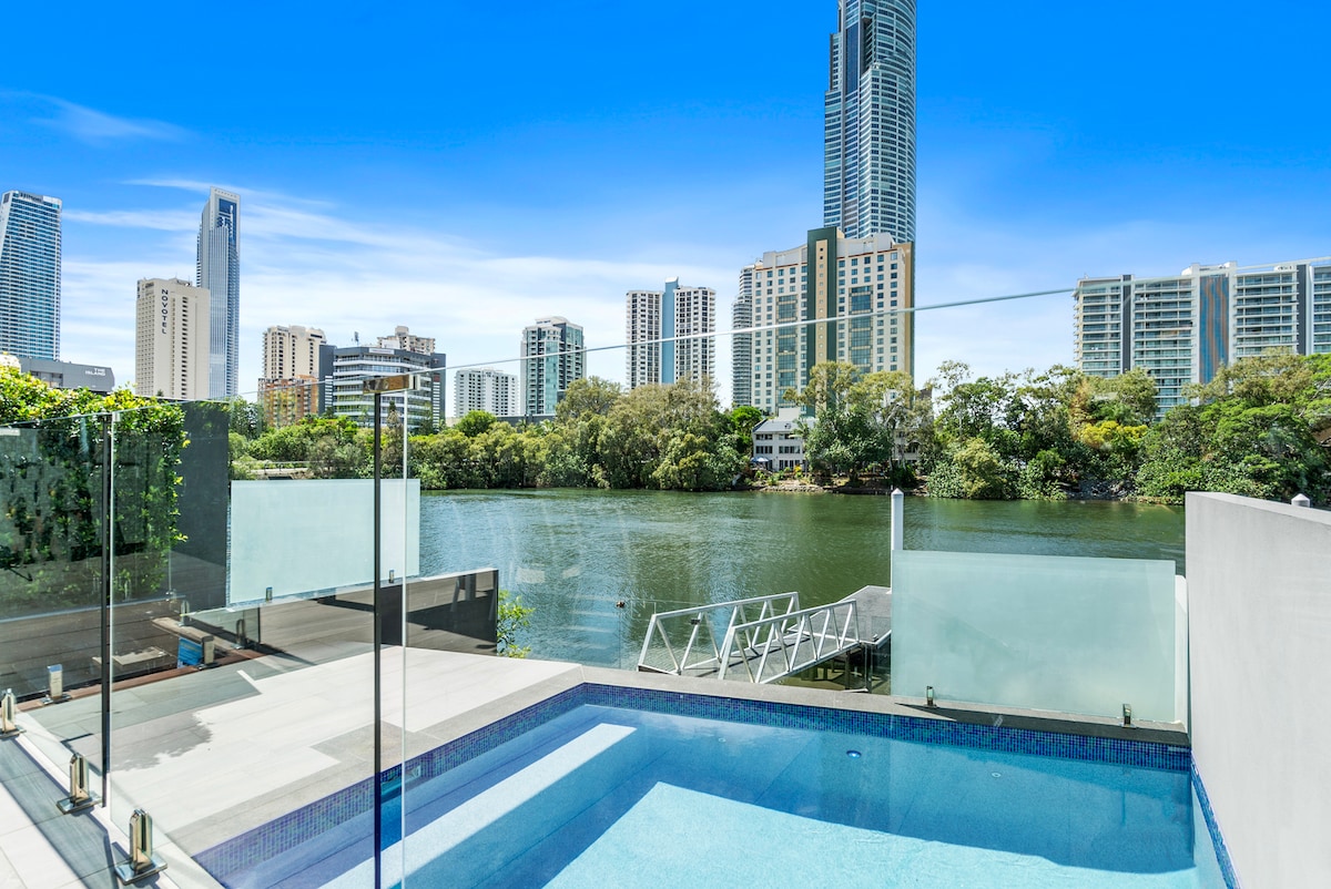 Bring family and friends to relax in this spacious riverside house spanning 4 levels. Have a picnic on the deck, take a dip in the heated plunge pool, or head down to the dock to go paddling or boating. Four levels of luxury, this home offers ultimate relaxation. Pets welcome 66A Sunrise sits on a quiet peninsula that provides amazing views of the heart of Surfers Paradise. Plenty of free unlimited on street parking right outside the house, always available.
