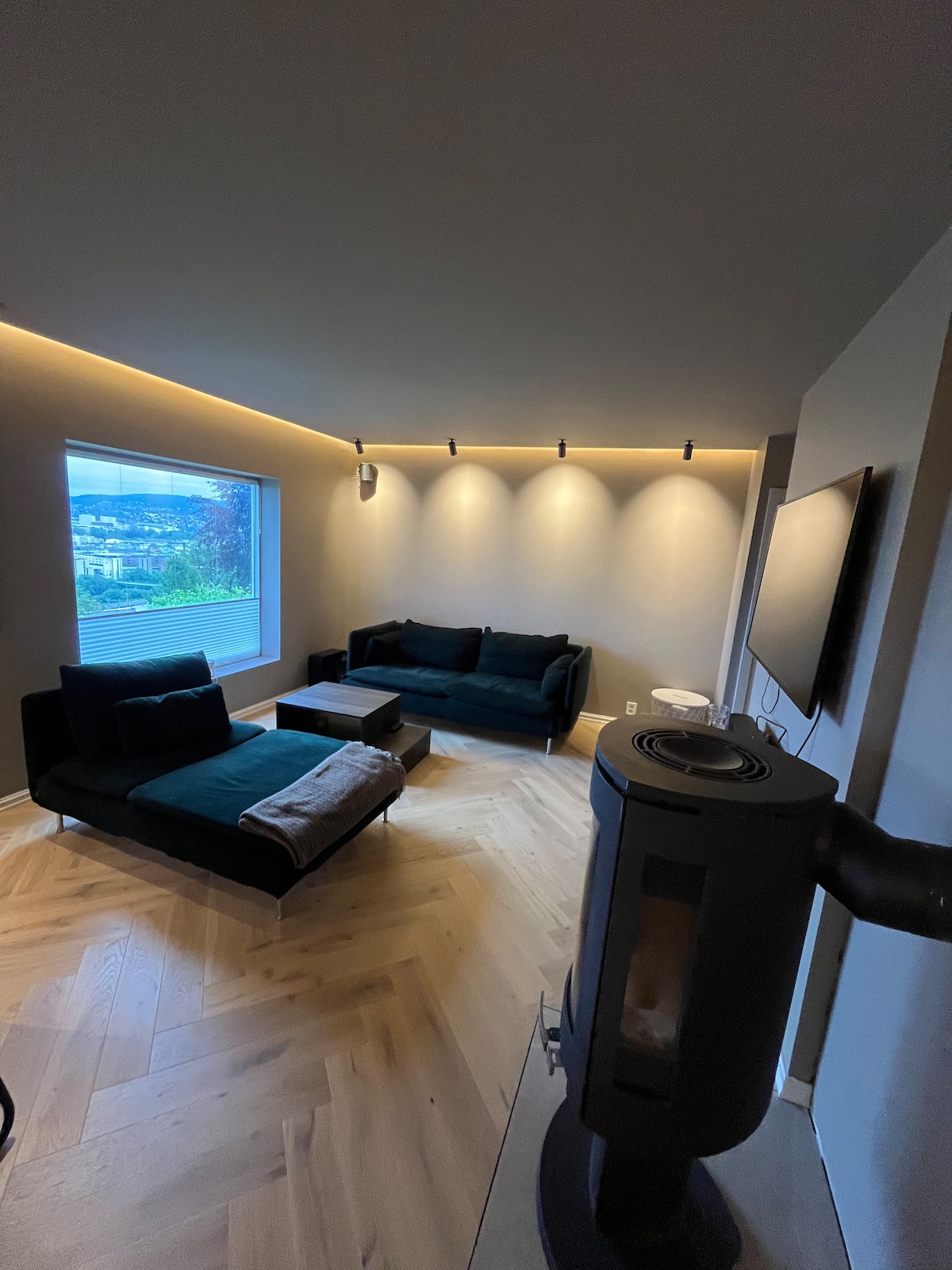 Neu renovierte und moderne Wohnung mit zwei Schlafzimmern in einer ruhigen Gegend von Byåsen. Schlafzimmer mit einem Doppelbett und einem Doppelschlafsofa im Wohnzimmer, das bequemen Schlafraum für bis zu vier Erwachsene bietet. Nur 5 Gehminuten zur Straßenbahn, die dich ins Stadtzentrum oder tief ins Feld bringt. Die Wohnung ist geschützt und abgelegen in einer ruhigen Wohnlage. Perfekt für einen ruhigen Aufenthalt mit Nähe zur Natur und Stadt. EV-Ladegerät verfügbar. Aufladen gegen eine Gebühr von 50 NOK pro Ladung.