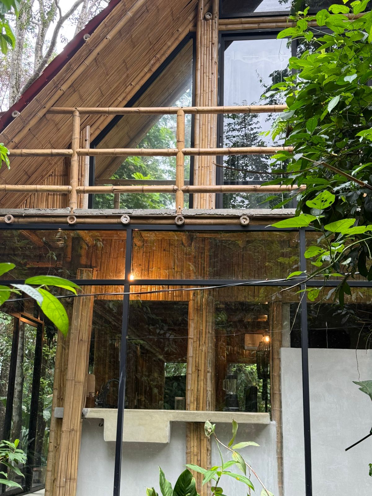 Zweistöckige Bambushütte, sehr hell, mit geräumigen Bereichen und unglaublichem Blick durch die großen Fenster. Gegenüber einem natürlichen Wasserfall gelegen, auf einem privaten Grundstück.