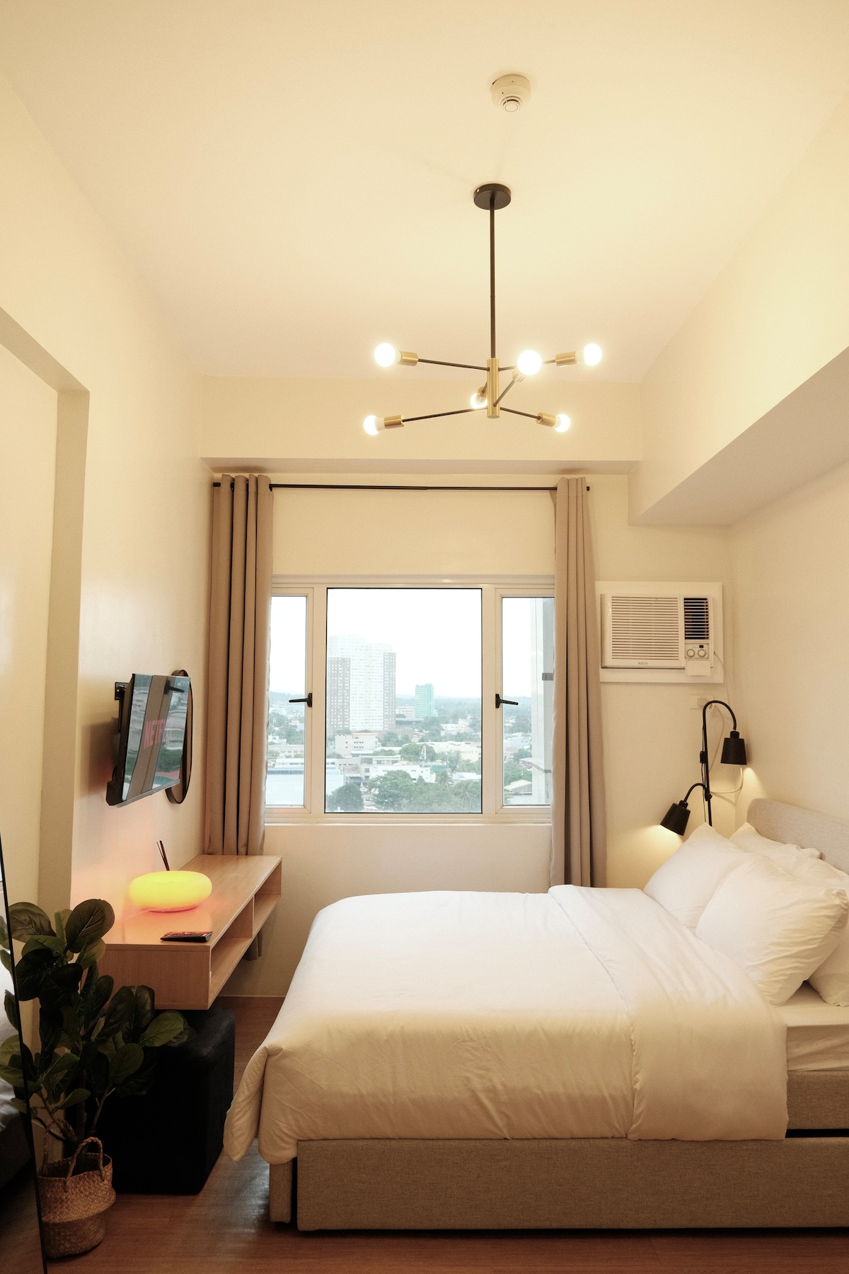 Eine ruhige, designgetriebene Eckeinheit mit 1 Schlafzimmer in der 24. Etage von Tower 1, Avida Towers Aspira — über dem Herzen von Cagayan de Oro City. Der Raum ist im modernen Design verwurzelt und hebt warme Umgebungsbeleuchtung, klare Linien und stilvolle Details hervor, die sowohl Komfort als auch Raffinesse schaffen. Egal, ob du dich entspannst, erkunde oder aus der Ferne arbeitest, das Queensize-Bett verspricht tiefe Ruhe, während dich der atemberaubende Blick auf die Stadt daran erinnert, dass alles, was du brauchst, in der Nähe ist — aber gerade weit genug für ein gutes Gefühl.