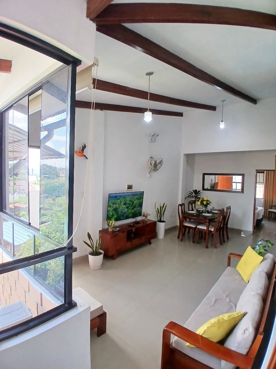 HEYSEN HAUS Wohnung 102 Schöne Wohnung im 1. Stock, mit Klimaanlage im Wohnzimmer mit 3 geräumigen Schlafzimmern, eines der Schlafzimmer hat eine Klimaanlage, Wohnzimmer mit 50" TV, Esszimmer, Küche, 2 Badezimmer mit heißem Wasser, Zugang zur Terrasse, um sich mit der Natur zu verbinden, wir sind nur 5 Minuten von der Plaza de Armas von Tarapoto entfernt, ideal für eine angenehme Erholung mit Familie oder Freunden.
