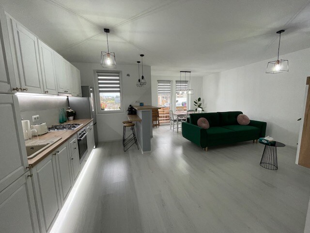 Eine geräumige Wohnung mit einem großen Schlafzimmer (Bett - 180 x 200) und einem großzügigen offenen Wohnzimmer in einer neuen Wohngegend, mit privaten Parkplätzen, komplett vor Stadtlärm geschützt und gleichzeitig nur 5 Fahrminuten vom Stadtzentrum entfernt. Der perfekte Ort für Familien mit Kindern, Paare oder Einzelreisende, die auch einen speziellen Raum für mobiles Arbeiten genießen können.