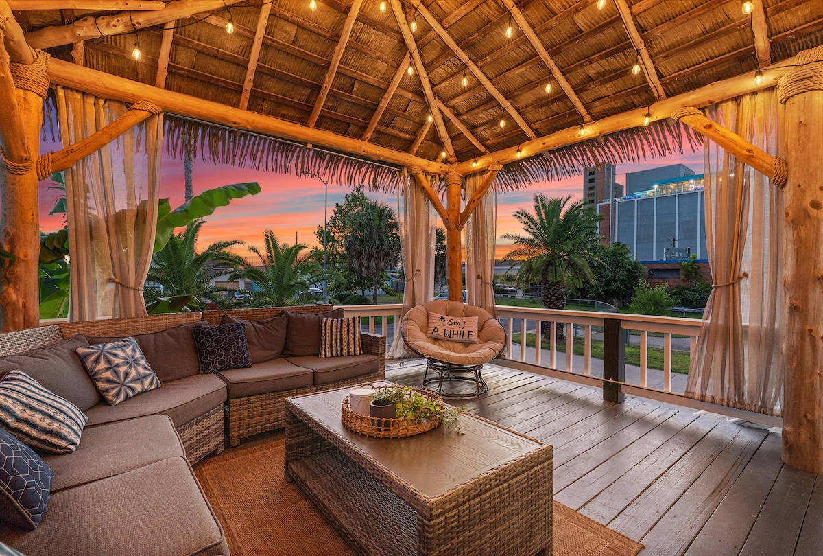 -Casita De Palmera- Entspanne dich auf dem beleuchteten, mit Palapa bedeckten Deck mit deinem Kaffee oder Cocktail! Familien- und haustierfreundlich! Weniger als eine halbe Meile von Galvestons historischer Innenstadt und eine kurze 4-minütige Fahrt vom Strand entfernt! In der Nähe von all dem Spaß, Shopping, Live-Musik und Restaurants auf The Strand! -Eingezäunter Garten -800+ MBPS WLAN -4 Smart-TVs mit Roku-Funktion zum Streamen mit deinen Konten -Arcade- & Brettspiele -Holzgrill - Strandtücher und Spielzeug In der Nähe von Kreuzfahrtterminals und EINEN Block vom Kreuzfahrtparkplatz entfernt!