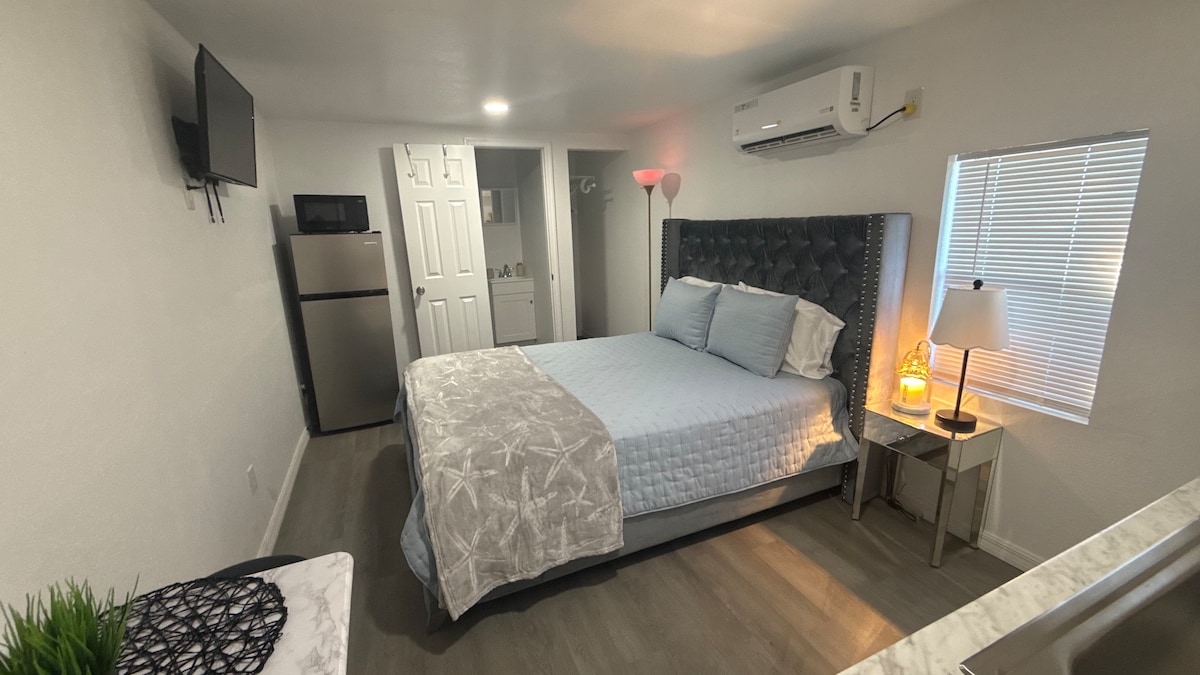 Entfliehe in unser wunderschön gestaltetes Studio, das Komfort und Stil bietet. Ganz gleich, ob du einen erholsamen Rückzugsort für dich allein, einen romantischen Kurzurlaub oder einen gemütlichen Aufenthalt für zwei Personen suchst: Diese ruhige Unterkunft mit Strandthema bietet die perfekte Balance aus Komfort, Bequemlichkeit und Charme. Du wirst von einem sauberen, modernen Interieur begrüßt, das Küsten-Dekor mit praktischen Annehmlichkeiten verbindet. Das Zimmer verfügt über ein bequemes Queensize-Bett, das mit einem atemberaubenden Canvas bezogen ist, das die Stimmung für ruhige, entspannende Abende schafft.