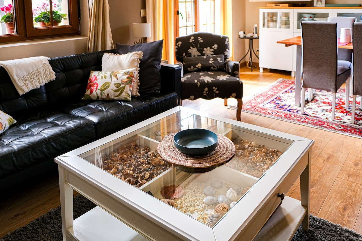 Exklusive Wohnung mit 100 m2. Gemütlicher, komfortabler und makelloser Raum mit einer sehr sorgfältigen Innenarchitektur, die die Funktionalität und Ästhetik sowohl bei Möbeln als auch bei Materialien und Beleuchtung optimiert. Es verfügt über große Fenster, die viel natürliches Licht und Panoramablick auf das Anwesen zulassen. Es ist mit allem ausgestattet, was sechs Gäste benötigen. Das Haus ist von einem etwa 300 m² großen Garten umgeben, der von wachsenden Buchen begrenzt wird und verfügt über einen Pool mit Quellwasser.