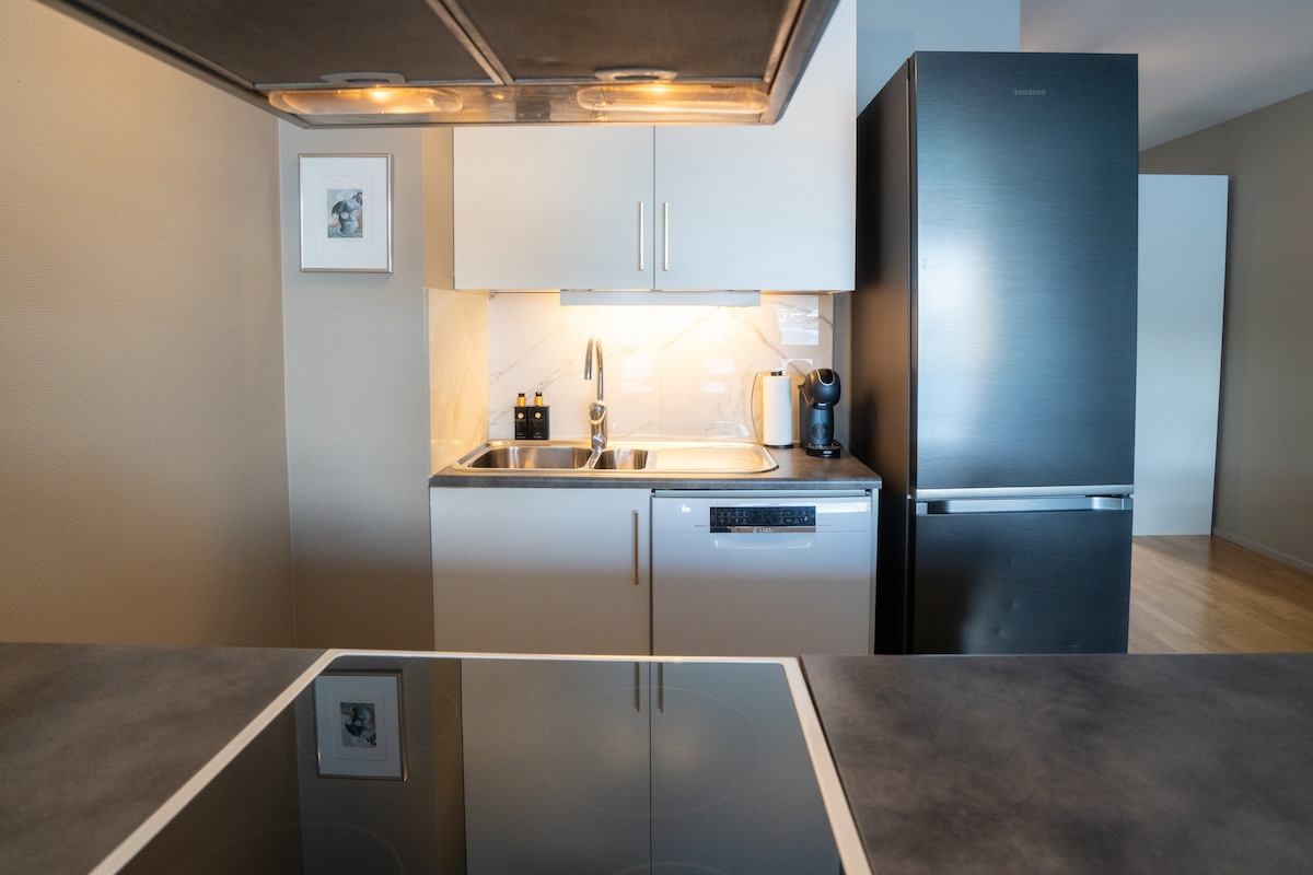 Die Wohnung befindet sich im 2. Stock und ist 43 m² groß. Die Wohnung verfügt über einen Flur, ein Schlafzimmer, ein Bad und ein Wohnzimmer mit Küchenzeile. Es gibt auch einen privaten Balkon. Das Viertel Vervet ist ein neu entwickelter Stadtteil in Tromsø, mit Restaurants und Cafés in unmittelbarer Nähe. Das Stadtzentrum liegt nur 5 Gehminuten von den Wohnungen entfernt, ebenso wie die Arktische Kathedrale auf der anderen Seite der Brücke. Das Apartmenthaus ist modern und liegt direkt am Hafen.