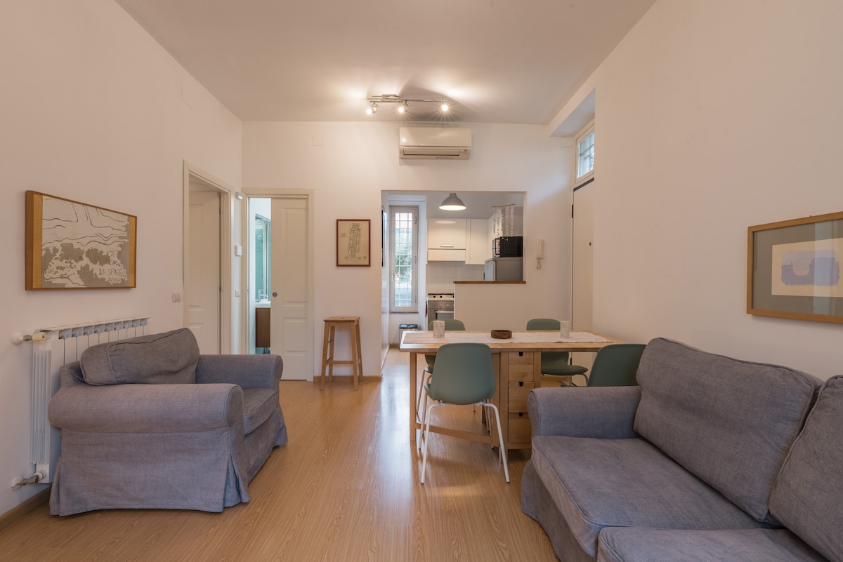 Wohnung im 1. Stock in einer 3-stöckigen Villa mit einem breiten Garten. Es ist ruhig und luftig. Sie verfügt über 1 Schlafzimmer mit eigenem Bad, eine möblierte Küchenecke und ein helles Esszimmer. Das Schlafzimmer mit Klimaanlage verfügt über ein Doppelbett/2 Einzelbetten; ein einzelnes Schlafsofa für eine 3. Person/ein Kind befindet sich im Esszimmer. WLAN. Der Bus ins Zentrum ist nur 100 m und die U-Bahn 800 m entfernt. Lebendiges Viertel mit echtem römischen Flair voller Weinbars, Bistros und Restaurants, in denen man „al fresco“ speisen kann. Freiluftmarkt und Supermarkt/Lebensmittelgeschäft usw. 100 m entfernt.