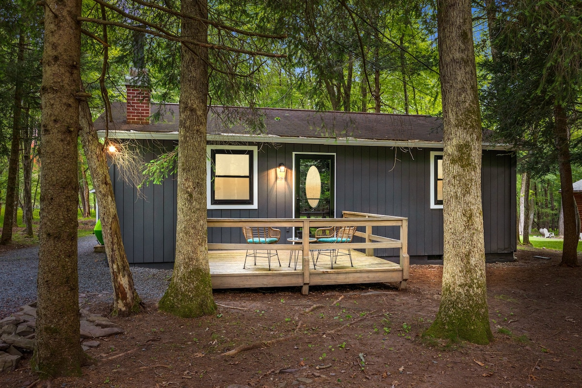 **Von House Beautiful 2022 zum „besten Airbnb in PA“ gewählt** Komm und übernachte in einem der charmantesten Chalets in den Poconos. Dieses Haus mit 2 Schlafzimmern (plus Schlafloft)/2 Badezimmern ist stilvoll, familienfreundlich und gut ausgestattet mit allem, was man braucht. Klimaanlage, um dich im Sommer kühl zu halten, für die gemütlichen Winternächte. Ein gemütlicher Keller zum Abhängen verfügt über einen zusätzlichen Holzofen und eine Tischtennisplatte. Draußen gibt es eine große Terrasse, einen Whirlpool für drei Personen und eine offene Feuerstelle.