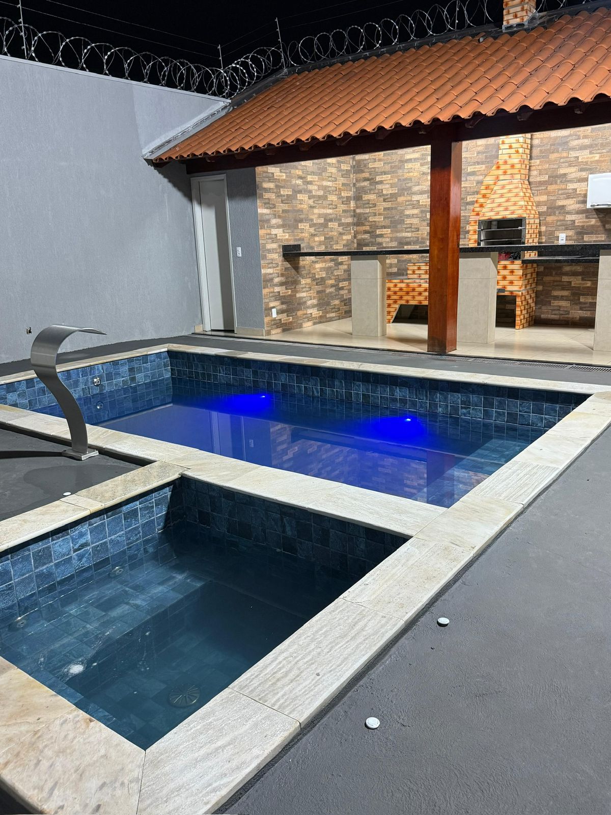-Pool -Ofuro - Lounges - Grillkiosk, Holzofen und Kochfeld -Acomoda für bis zu 10 Personen, 3 Doppelbetten und zwei zusätzliche Doppelmatratzen -3 Schlafzimmer mit Doppelbett (2 mit LED-Fernseher, 1 Suite) - 2 soziale Bäder - Küche mit Kühlschrank, Herd, Mikrowelle, Mixer, Wasserfilter, Pfannen, Tellern, Besteck und Tassen - Wohnzimmer mit Couch, Esstisch (6 Personen) und Hilfstisch (4 Personen) - Bedingt für die Zahlung einer zusätzlichen Gebühr (50,00 Tag).