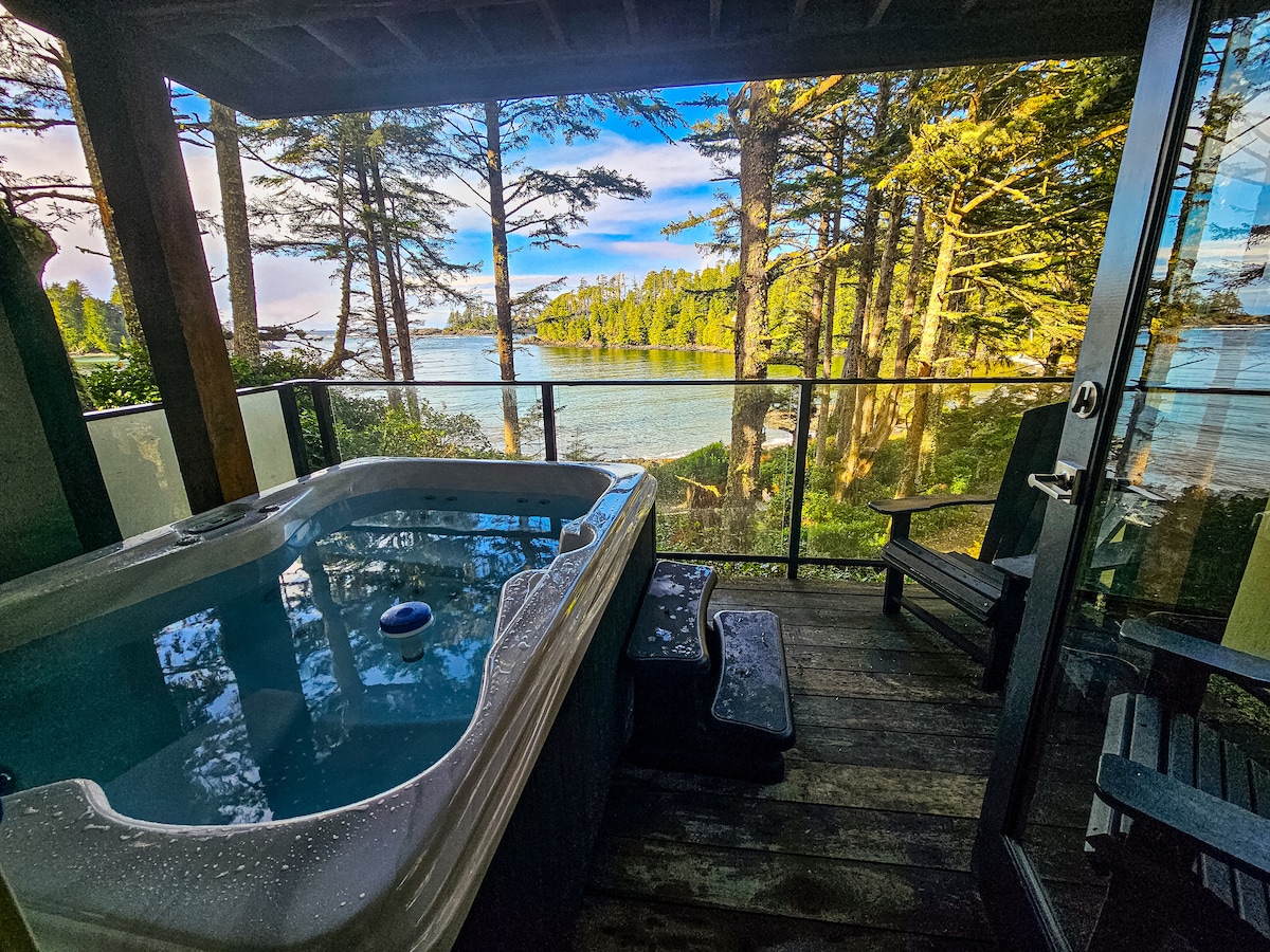 SALTWOOD – Ein guter Ort IG: @saltwoodbeachhouse ENTSPANNTER LUXUS MIT UNUNTERBROCHENER AUSSICHT. Direkt am Pazifik und dem legendären Wild Pacific Trail gelegen. Beobachte Stürme an deinem Kamin oder beobachte den Sonnenuntergang von deinem privaten Whirlpool aus. 2 Schlafzimmer mit allen Annehmlichkeiten. Gourmet-Küche, raumhohe Fenster, Gaskamin, Frame-TV, private Terrasse mit Whirlpool und diese Aussicht. Bietet bequem Platz für 4 Erwachsene – und ist natürlich der perfekte romantische Rückzugsort für 2.