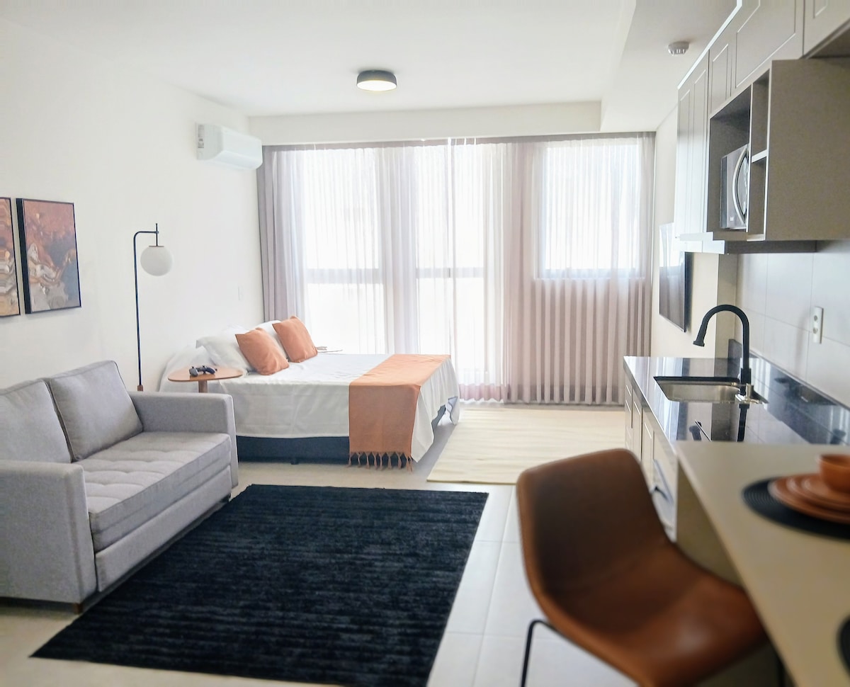 Auf der Suche nach einem gemütlichen Ausgangspunkt im Herzen der Stadt? In diesem gut geplanten Loft wirst du dich wie zuhause fühlen. Das Hotel liegt in der Innenstadt von Florianopolis und ist perfekt für jemanden, der die Insel erkunden oder an einer Veranstaltung in der Nähe teilnehmen möchte. Beinhaltet: - Queensize-Doppelbett - komplette Gourmet-Küche - Waschmaschine und Trockner - Großer Tisch für Mahlzeiten und Homeoffice - 360-Grad-Drehfernseher, damit du von jedem Ort im Loft aus zuschauen kannst - Sauberes und modernes Badezimmer - WLAN - Komplette Klimaanlage
